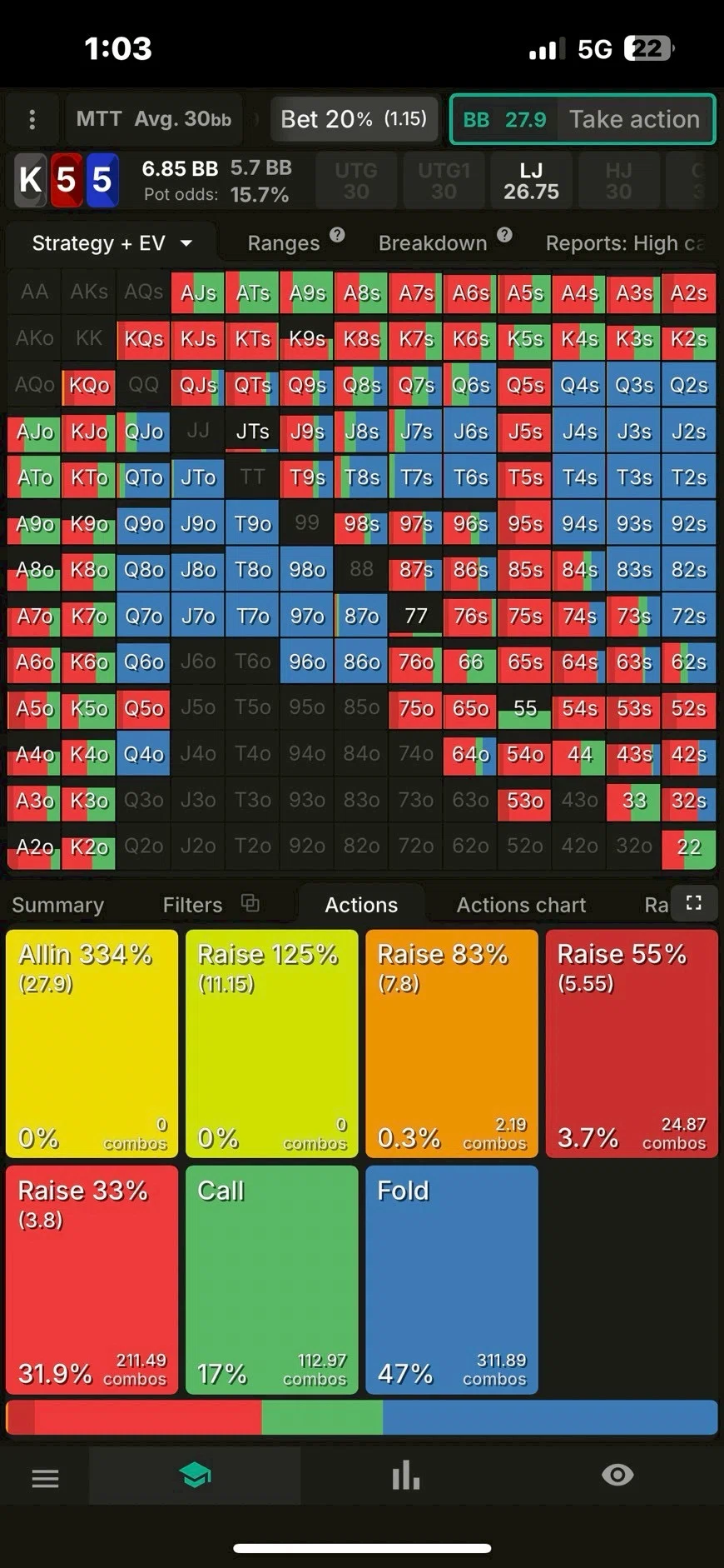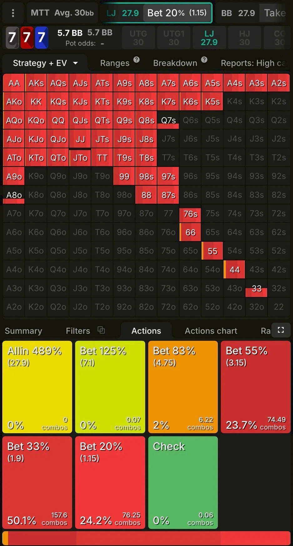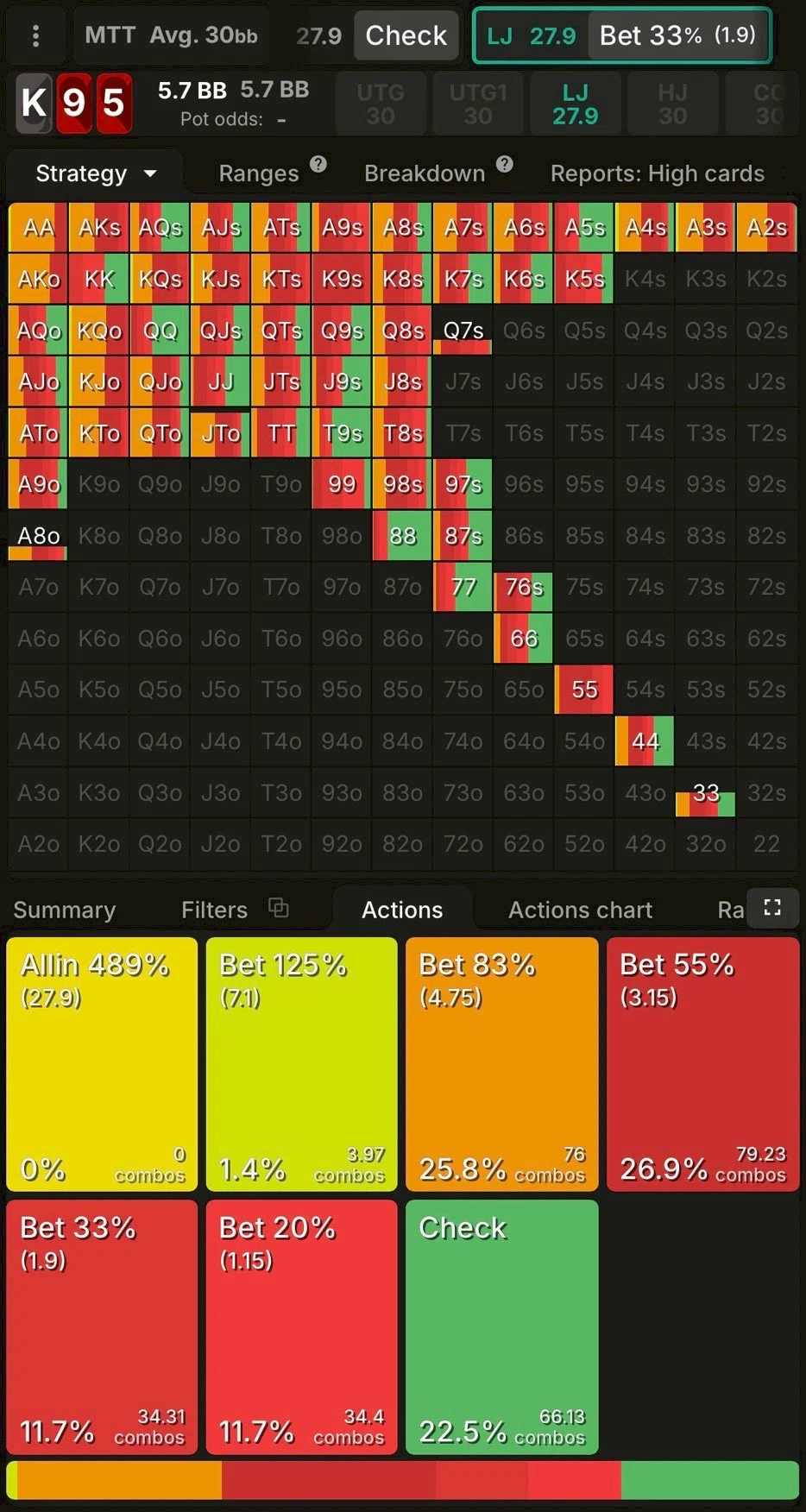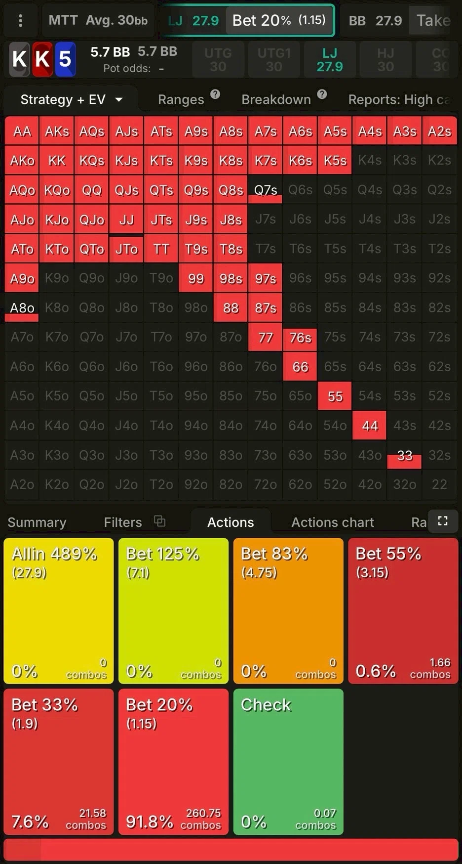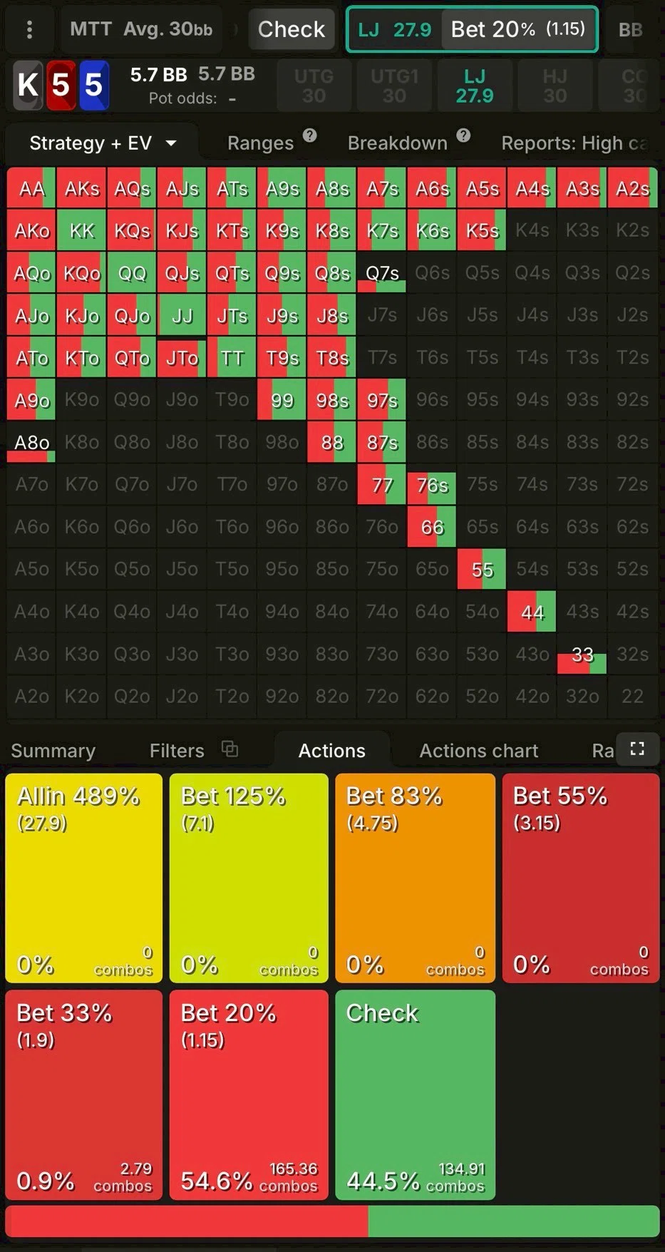 - チェック頻度が高いハンド: ATs〜AQs / ポケットペア / K5s〜K7s など