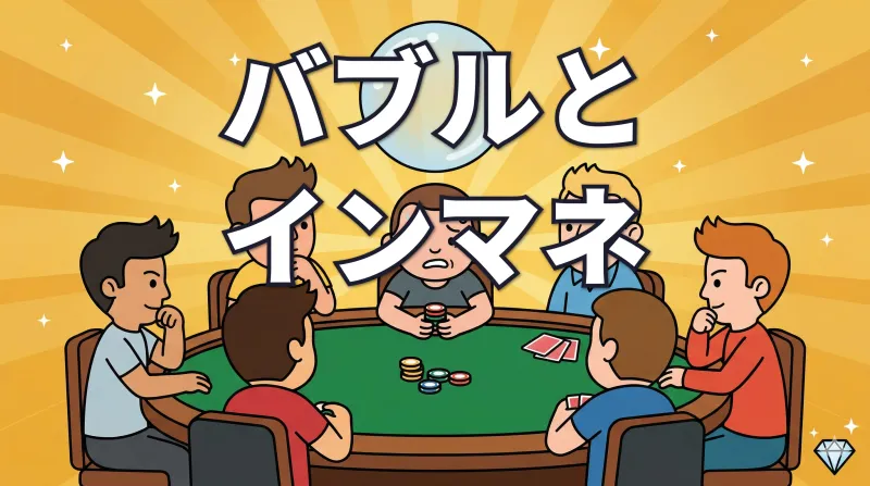 ポーカートーナメントの「バブル」と「インマネ(ITM)」の意味を初心者向けに解説。バブルライン・バブルボーイ・インマネ率・インプラ(ITP)など関連用語もまとめて紹介します。