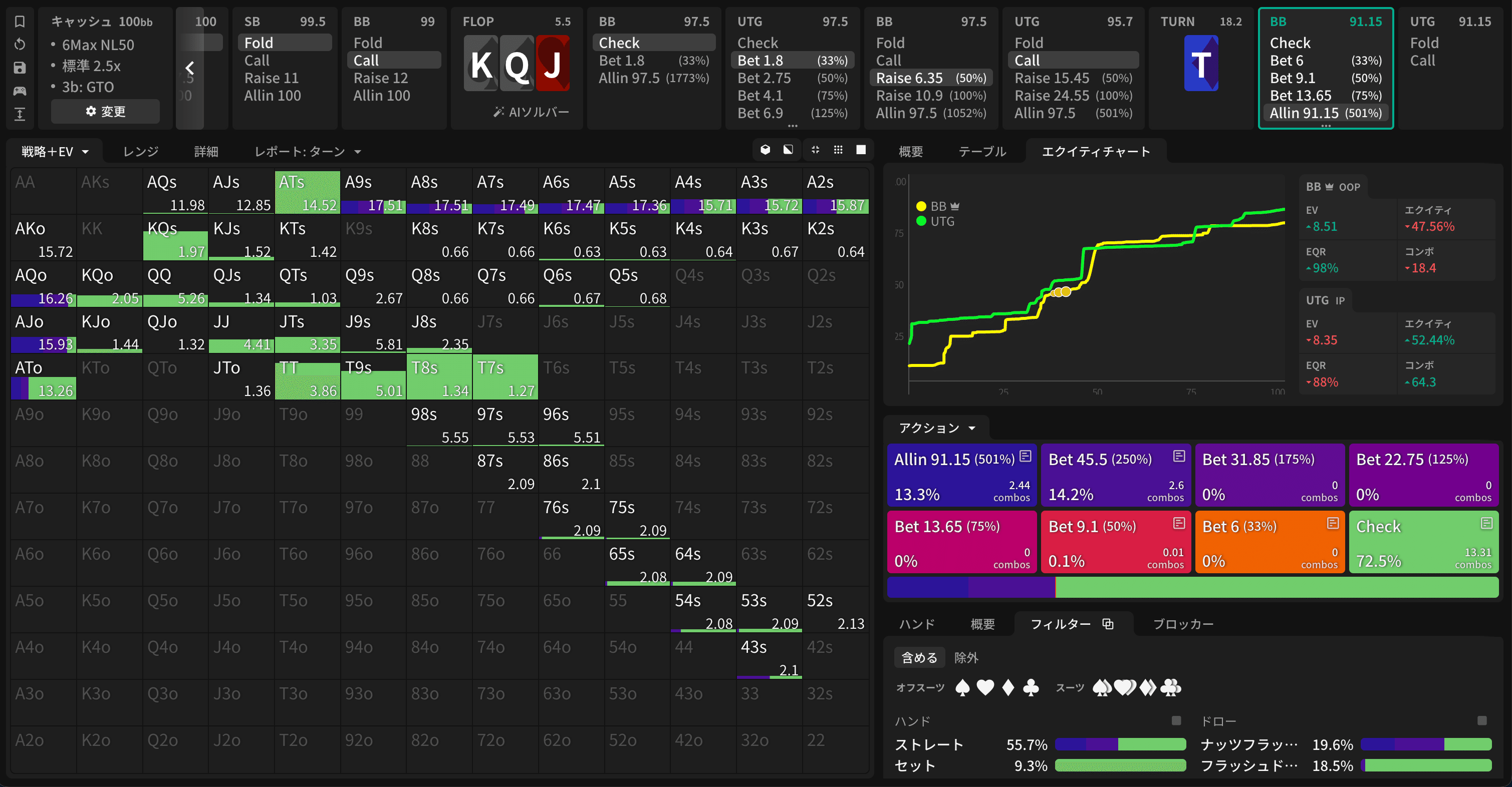 ナッシュ均衡では、このスポットにおいてBBのオールインがA9sのみで行われ、UTGはA9s以外でこのオールインをコールしないことがわかっている。
