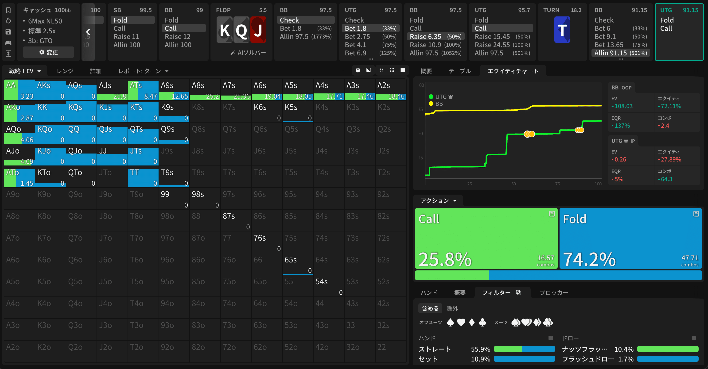 実際にGTO Wizardで該当するスポットを確認すると[図1・図2]、turnでall inを行うnut straightの一部にはFDが付いており、その割合は38%程度となっていることがわかる。これは上記の見積もりと非常によく整合している。UTGはこのall inに対して、同じくAXによるnut straightのみでcallするが、FD suitを持たないnut straightはindifferent(またはfold)になる。