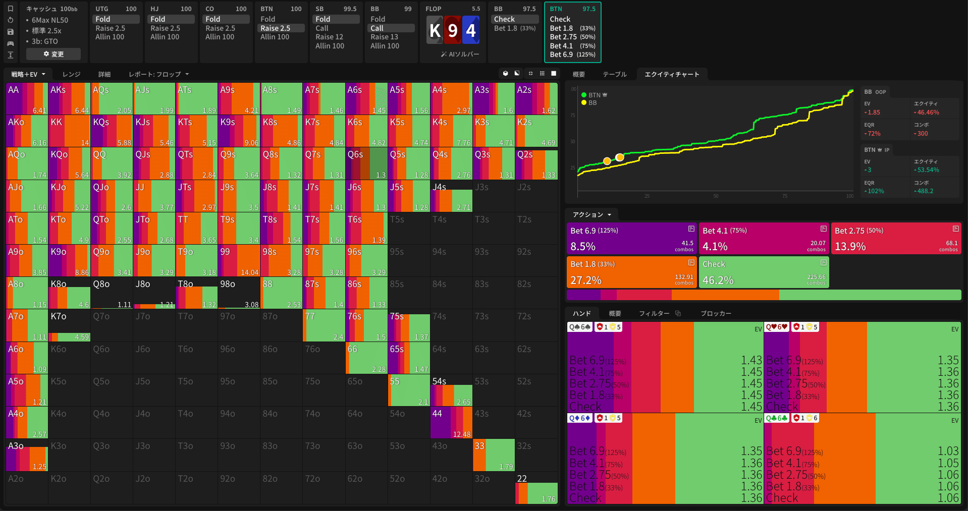 Figures 1 and 2 show the C-bet strategies on a K94r board for BTN vs. BB SRP and SB vs. BB SRP respectively. In the bottom-right of each figure, the frequency for Q6s (a trash hand) is enlarged. When IP (BTN vs. BB), the solver bets at some frequency regardless of suit. However, when OOP (SB vs. BB), hands without a BDFD almost always pure check.