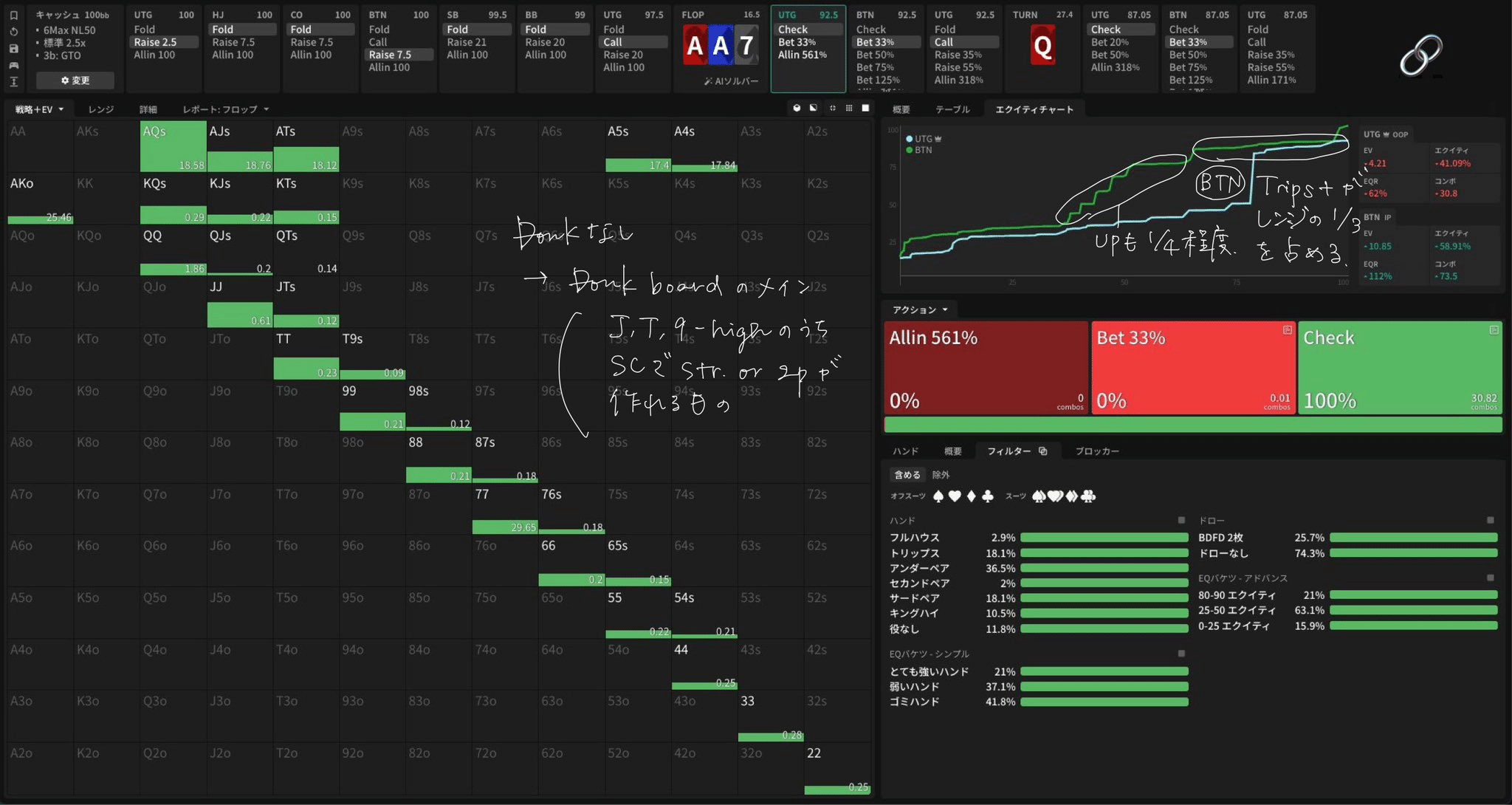 BTN:Trips+がレンジの1/3を占める、UPも1/4程度と強い。