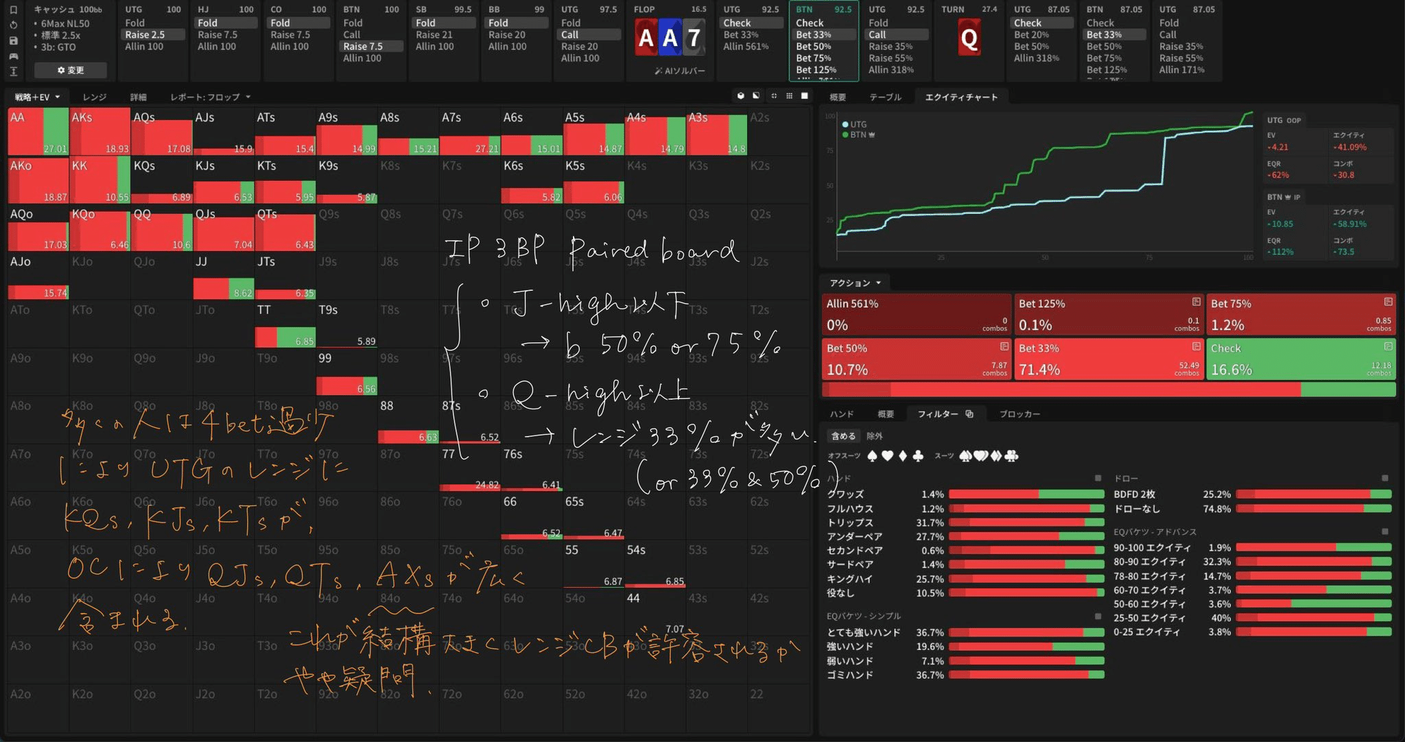 GTOWizardのソリューションをもとに UTG vs. BTN 3bet pot の A♥A♦7♠Q♥ ボードにおける A-Pair boardに存在する特殊なTurn donk戦略(node: xbc-xb?) を解説します。各ストリートの戦略をGTOの観点から分析し、言語化しています。