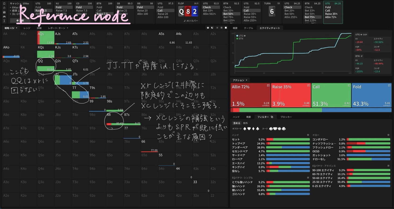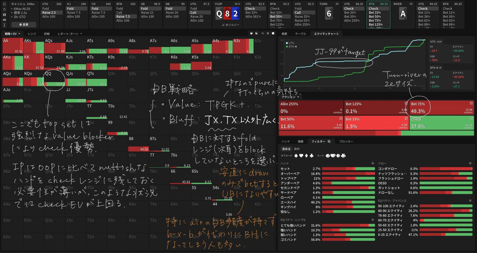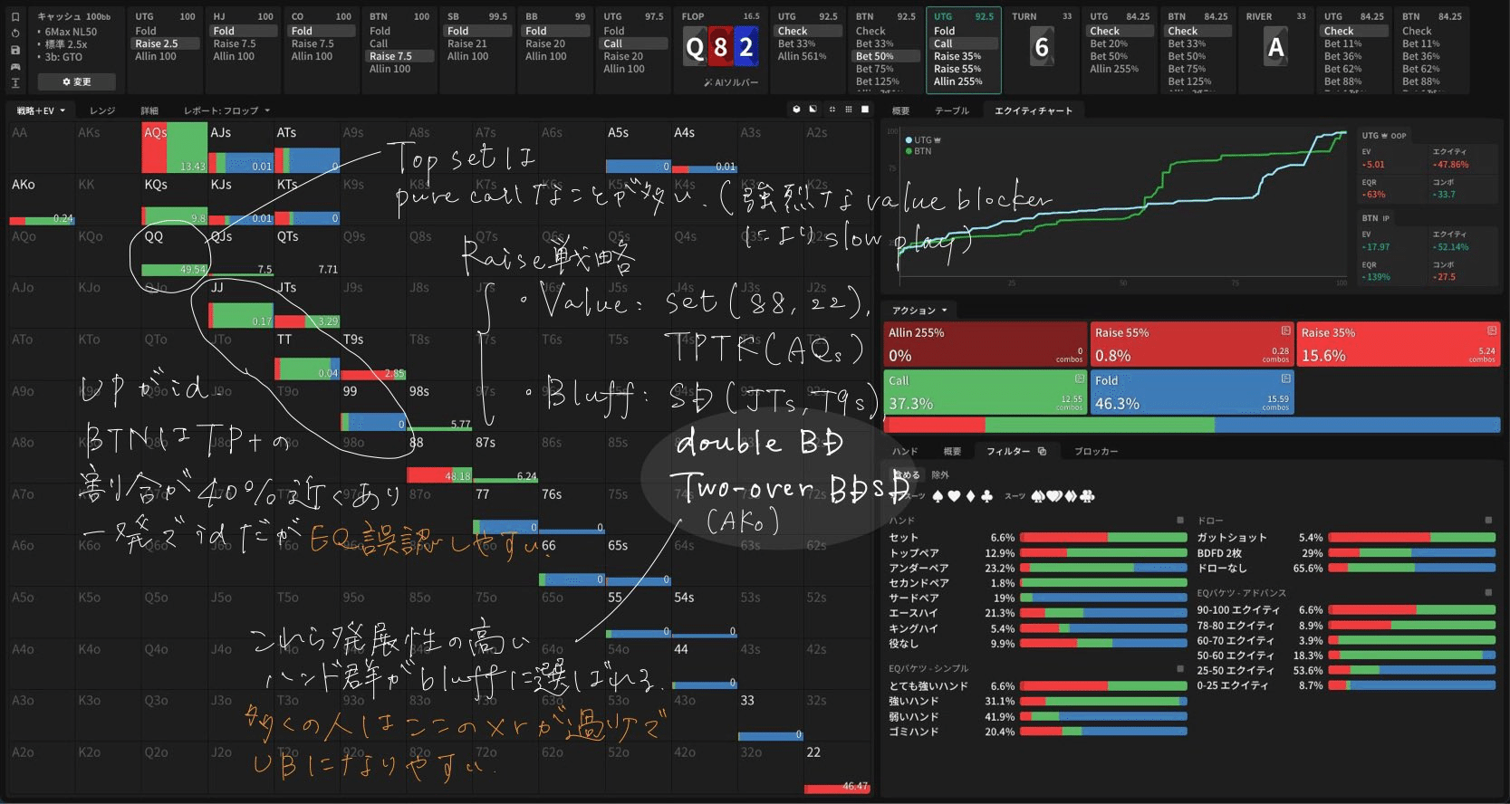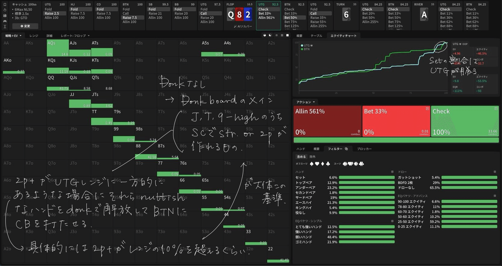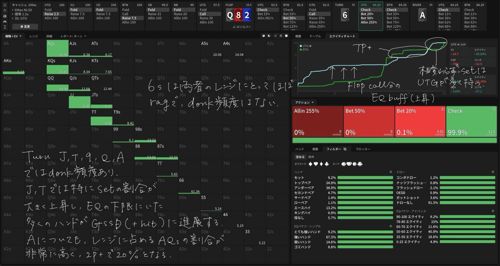 Turn J, T, 9, Q, Aではdonk頻度あり、J, Tでは特にsetの割合が大きく上昇し、EQの下限に居た多くのハンドがGSSD(+hit)に進展する。Aについても、レンジに占めるAQsの割合が非常に高く、2p+で20%の割合となる。