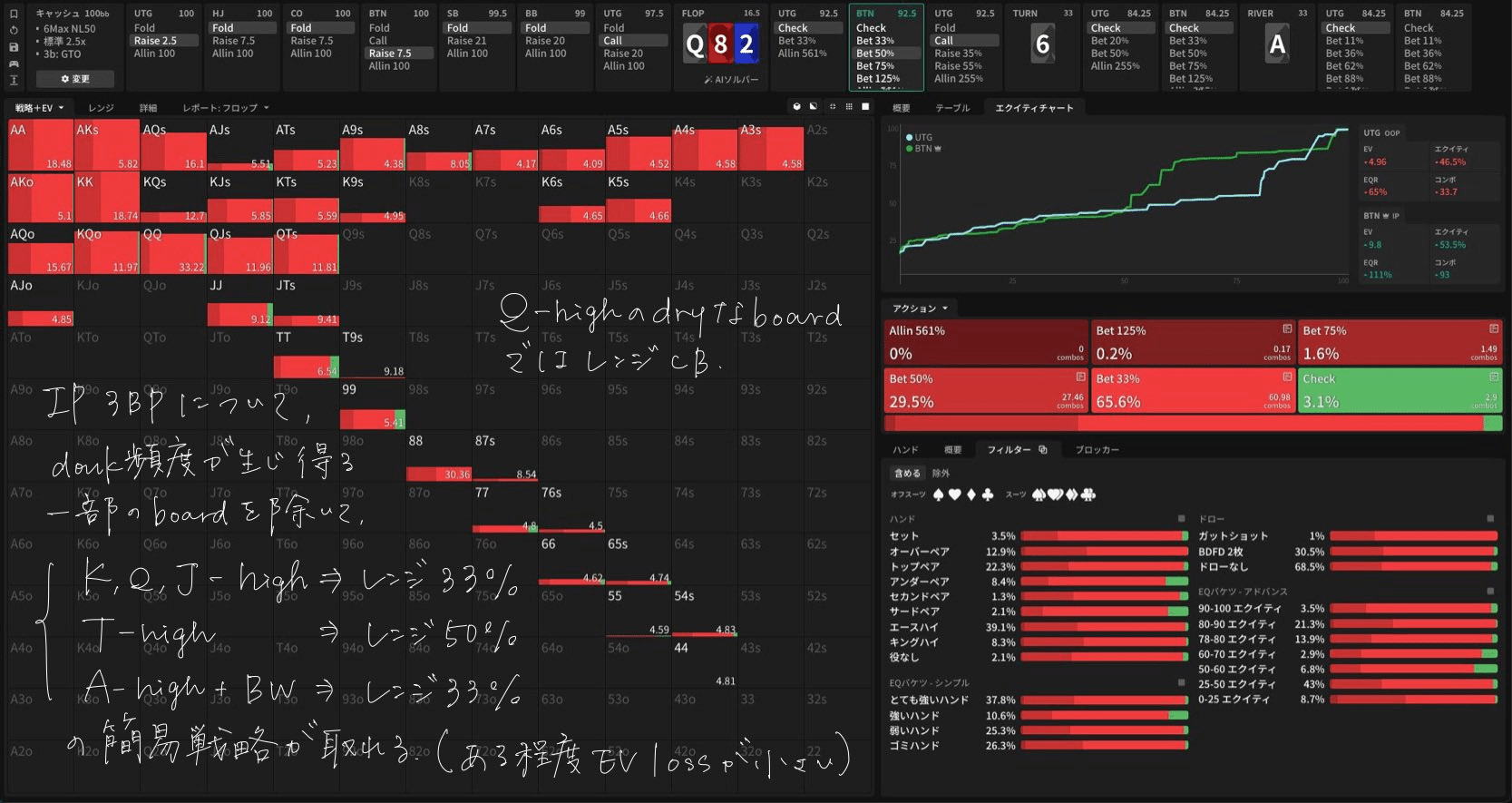 【GTO戦略解説】IP 3bet pot基本戦略【UTG vs. BTN 3bet pot】【dryなQ-high board】