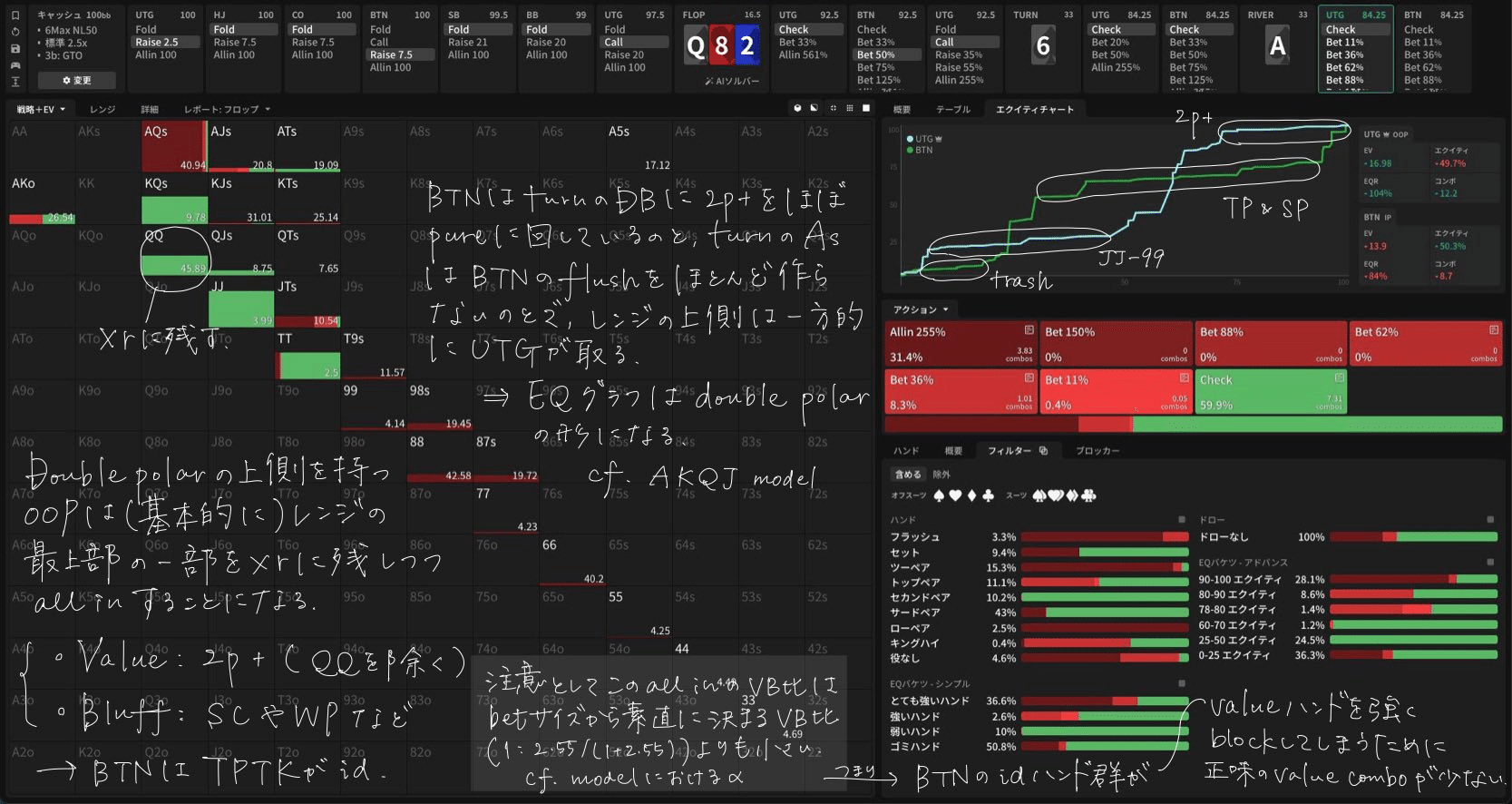 注意として、このall inのVB比はbetサイズから素直に決まるVB比(1:2.55 / (1+2.55))よりも小さい。cf. modelにおけるα。つまり、BTNのidハンド群がvalueハンドを強くblockしてしまうために正味のvalue comboが少ない。