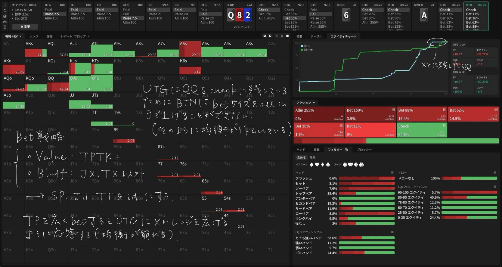 UTGはQQをcheckに残しているためにBTNはbetサイズをallinまで上げることができない。(そのように均衡が作られている)