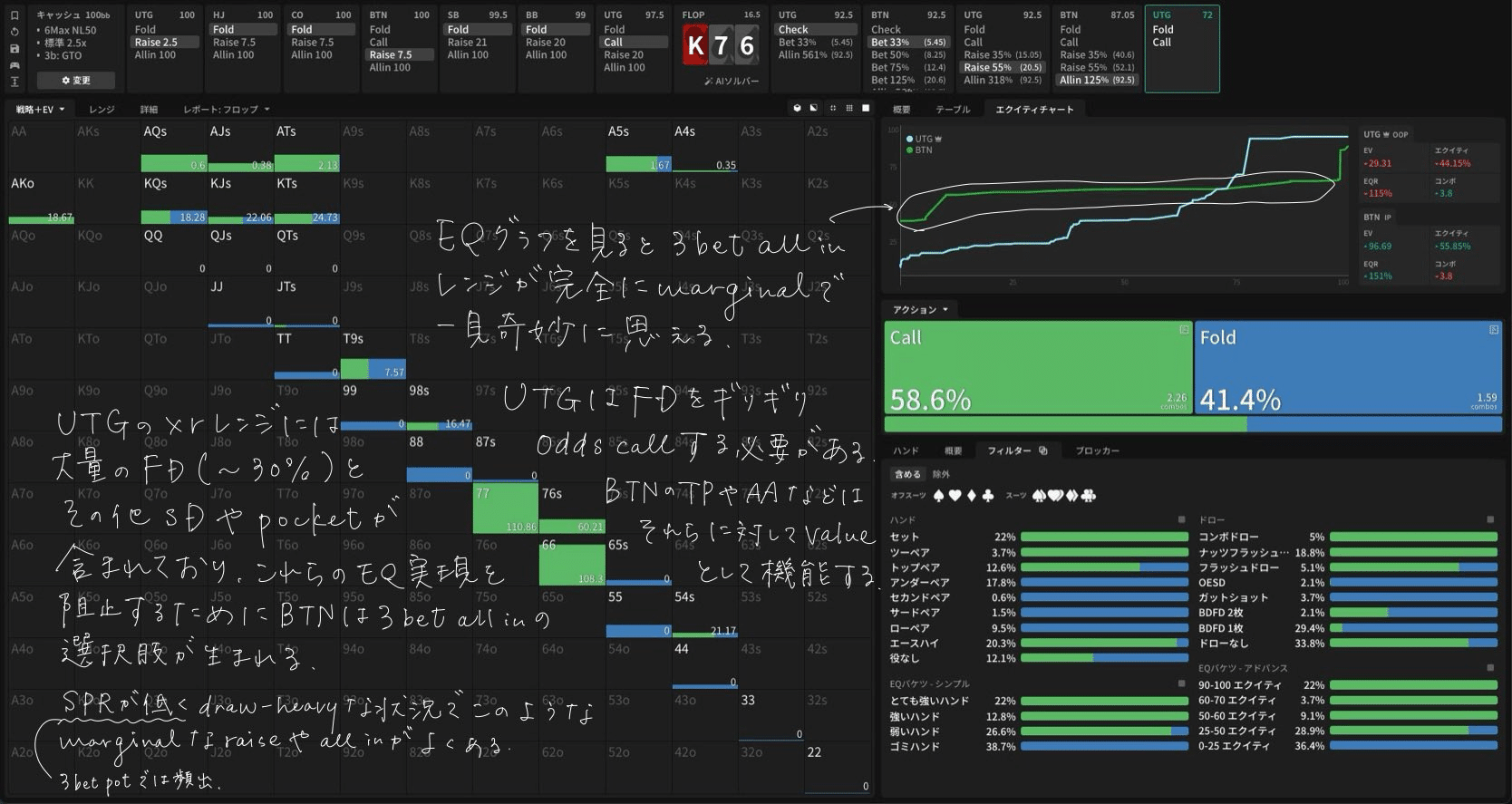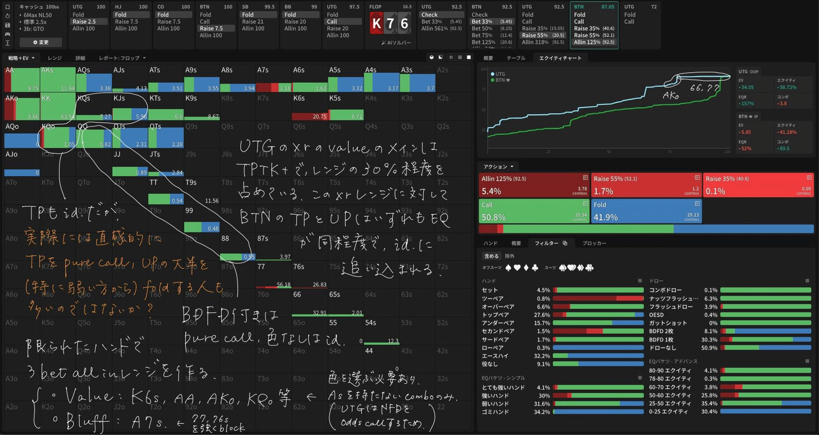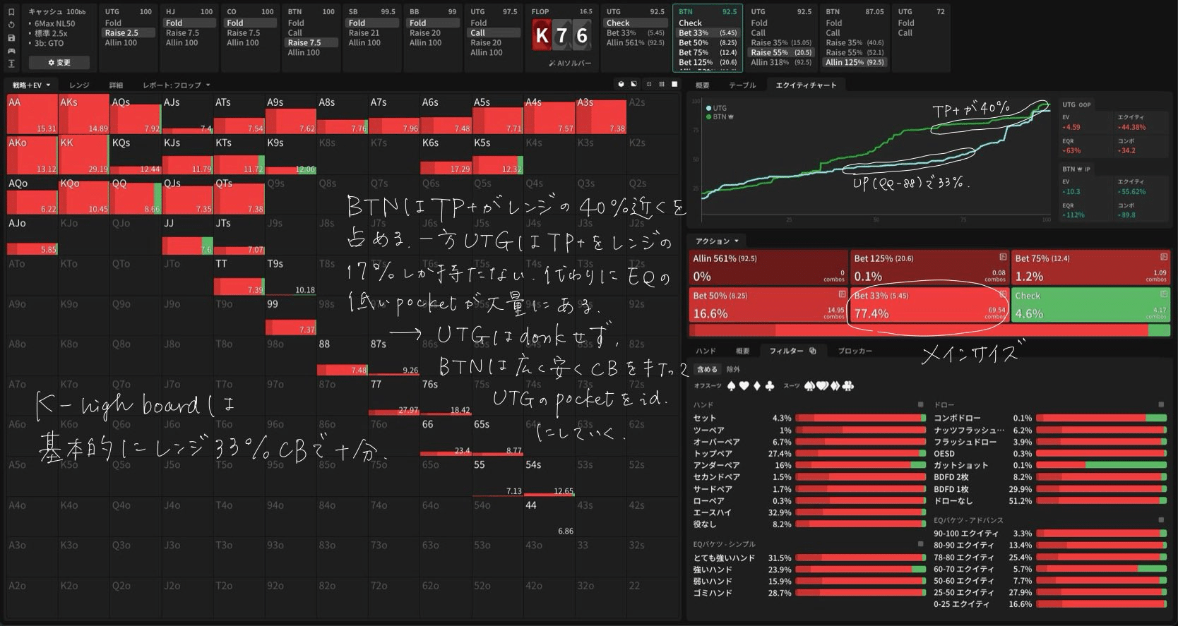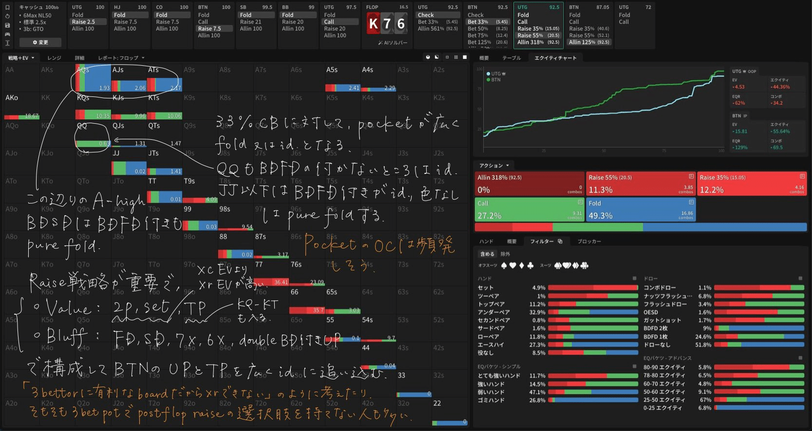 - Flop — Flop K❤7♠6♠ CB戦略・Flop K❤7♠6♠ CBに対する応答・Flop K❤7♠6♠ xrに対する応答・Flop K❤7♠6♠ 3betに対する応答