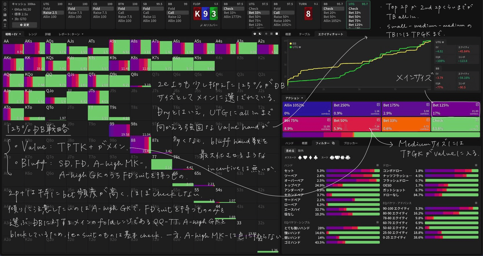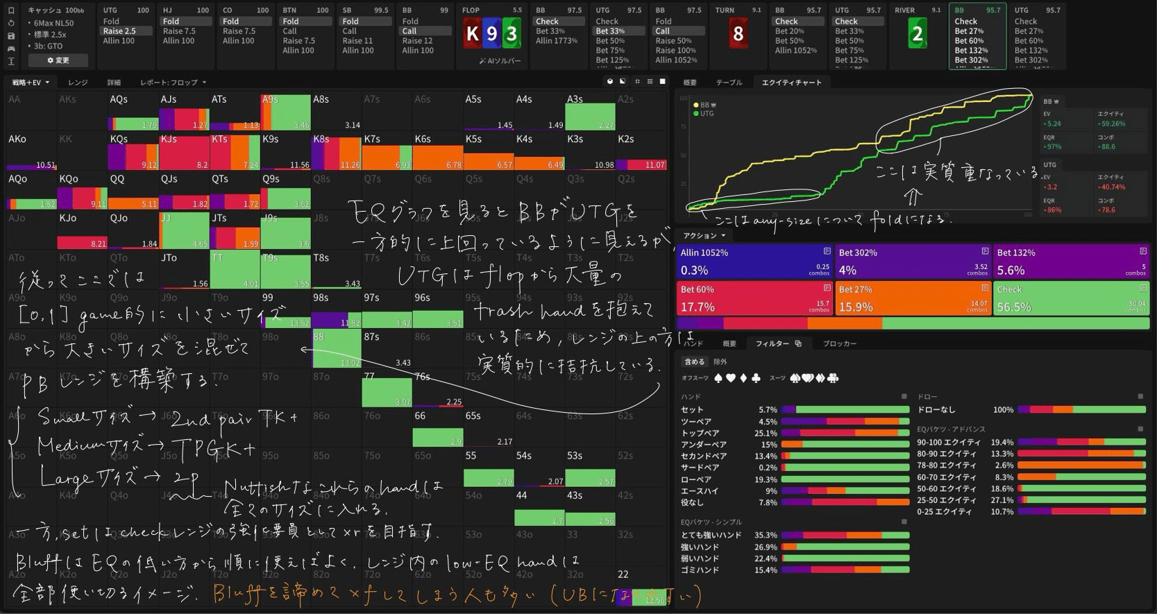 GTOWizardのソリューションをもとに UTG vs. BB SRP の K♥9♦3♣8♥2♣ ボードにおける K-high boardにおけるFlop xr, River probe戦略(node: xbc-xx-b?) を解説します。各ストリートの戦略をGTOの観点から分析し、言語化しています。