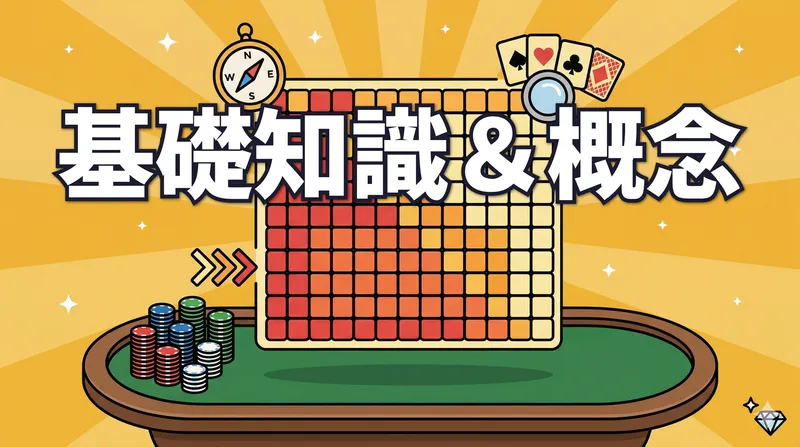 ポーカーの基礎知識と重要な概念をまとめて解説。ハンドレンジの読み方、ポジション別戦略、IP/OOP、ボードテクスチャ、CB・バレル・ドンクベットまで順番に学べます。